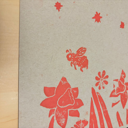 Sunny Rays original block print; bicycle, bumblebee, daffodils
