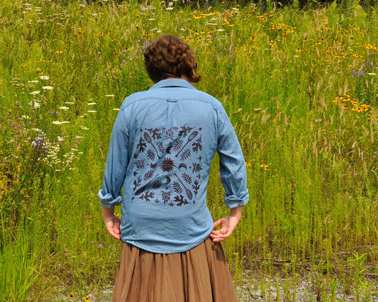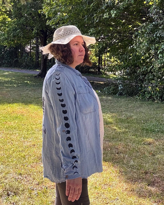 Luna Love-me; long sleeve denim shirt featuring forget-me-nots and moon phases
