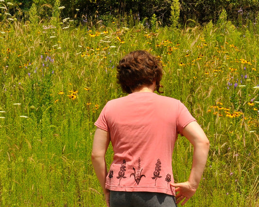 Tous les vêtements sont d'occasion et recyclés avec nos motifs imprimés à la main. Les images sont des tampons d'impression en bloc sculptés à la main, appliqués à l'aide d'une encre sans danger pour les tissus pour une tenue durable.